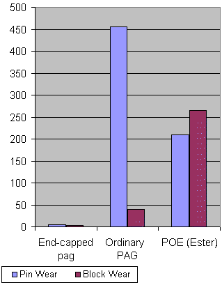 Chemical stability and wear-resistance are the two major areas of performance difference. When exposed to high levels of moisture and heat, POE (Ester) may undergo hydrolysis, causing it to revert back to its original components of acid and alcohol. The table at the bottom of the page depicts the drastic differences in wear between Ester and “end-capped” PAG.